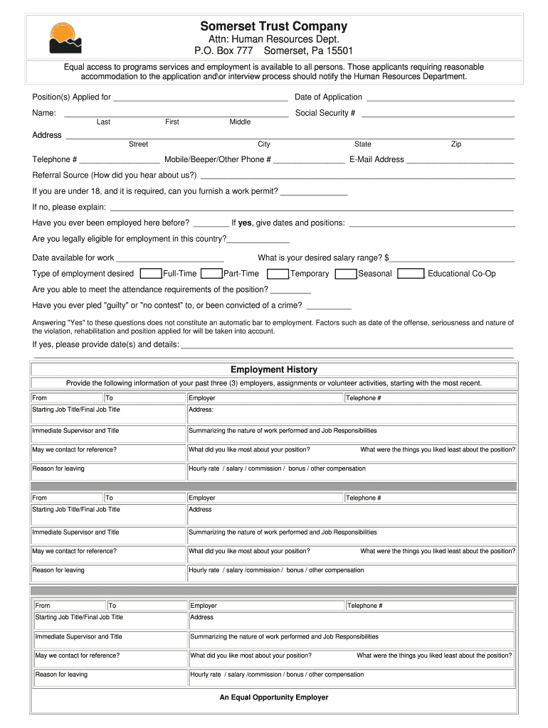 Somerset Trust Company Attn: Human Resources Dept. P.O. Box 777 Somerset, Pa 15501 Equal access to programs services and employment is available to all persons. Those applicants requiring reasonable
