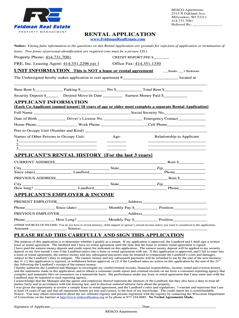 FRESCO Apartments 2515 N Oakland Ave. Milwaukee, WI 53211 414.731.7081 Referred By: RENTAL APPLICATION www.FeldmanRealEstate.com Notice: Giving false information to the questions on this Rental Application