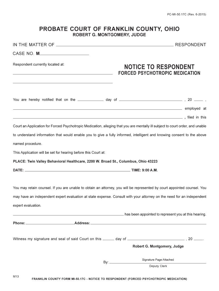 Data Save Enabled PCMI50.17C (Rev. 62015) PROBATE COURT OF FRANKLIN COUNTY, OHIO ROBERT G. MONTGOMERY, JUDGE IN THE MATTER OF RESPONDENT CASE NO. M NOTICE TO RESPONDENT currently located at: FORCED