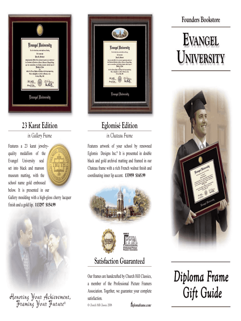 This document is an order form for various diploma frames featuring the Evangel University seal, available in different styles and finishes, along with pricing details and ordering instructions.