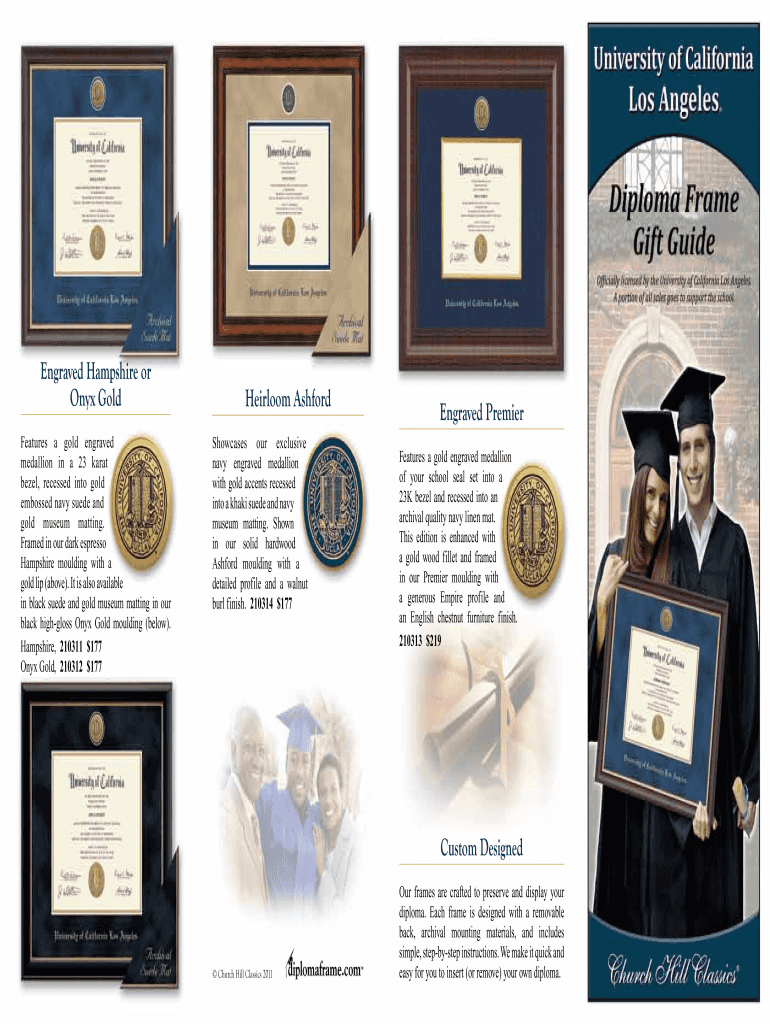 Order form for various designs of diploma frames offered by Church Hill Classics, including pricing and shipping details.