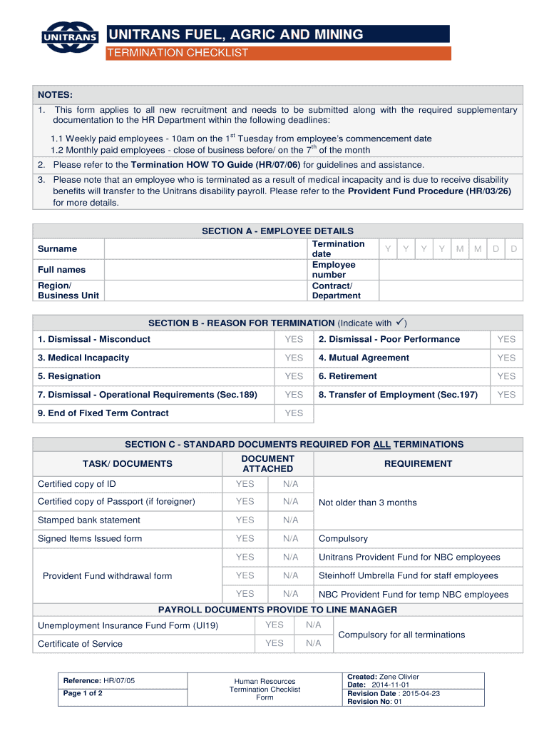 TERMINATION CHECKLIST NOTES: 1. This form applies to all new recruitment and needs to be submitted along with the required supplementary documentation to the HR Department within the following deadlines: