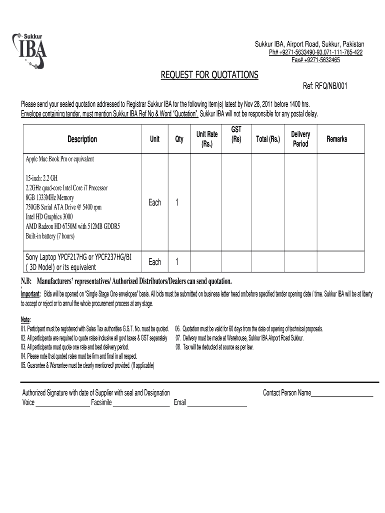 SSS Sukkur IBA, Airport Road, Sukkur, Pakistan pH# +9271563349093,071111785422 Fax# +92715632465 REQUEST FOR QUOTATIONS Ref: RFQ/NB/001 Please send your sealed quotation addressed to Registrar Sukkur