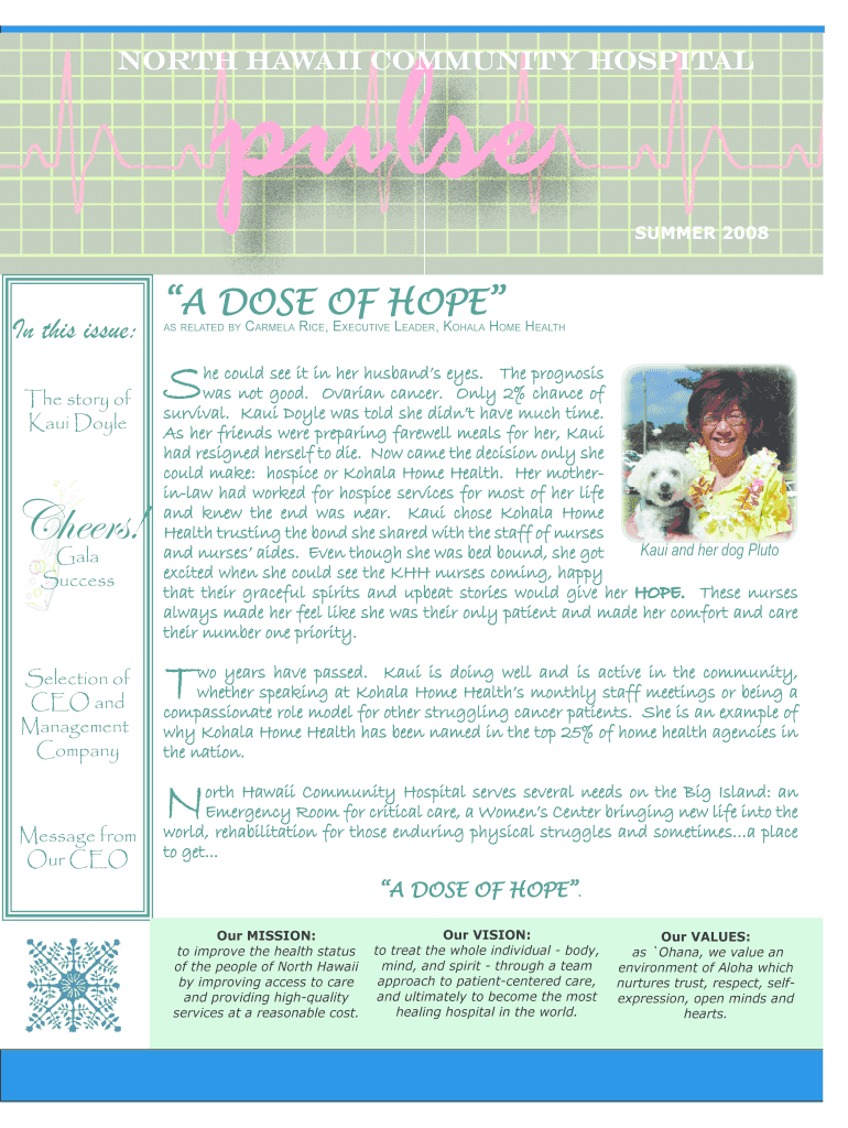 NORTH HAWAII COMMUNITY HOSPITAL SUMMER 2008 In this issue: The story of Kali Doyle Cheers! Gala Success Selection of CEO and Management Company Message from Our CEO A DOSE, OF HOPE C R E L, K H AS