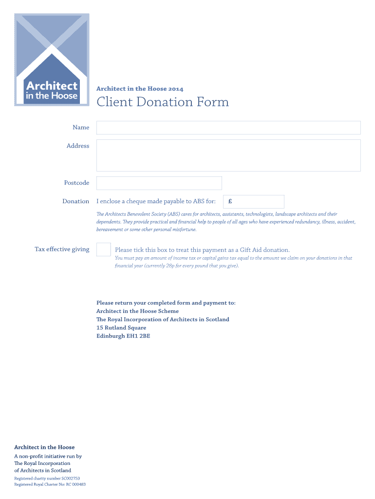 Architect in the House 2014 Client Donation Form Name Address Postcode Donation I enclose a check made payable to ABS for: The Architects Benevolent Society (ABS) cares for architects, assistants,