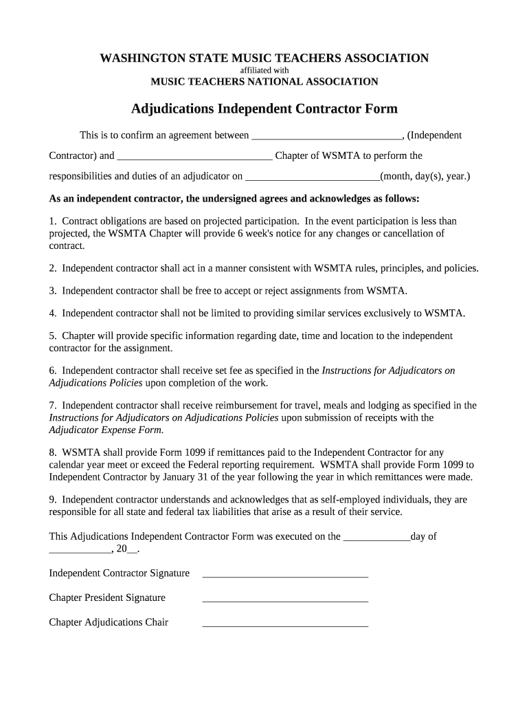 WASHINGTON STATE MUSIC TEACHERS ASSOCIATION affiliated with MUSIC TEACHERS NATIONAL ASSOCIATION Adjudications Independent Contractor Form This is to confirm an agreement between, (Independent Contractor)