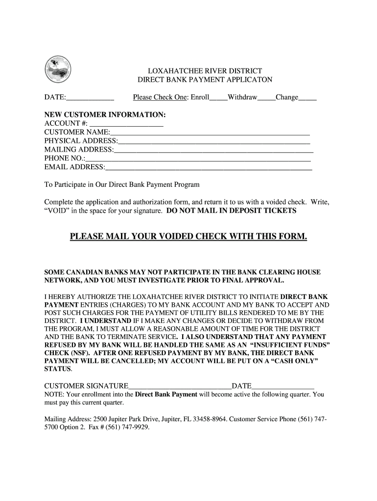 LOXAHATCHEE RIVER DISTRICT DIRECT BANK PAYMENT APPLICATION DATE: Please Check One: Enroll Withdraw Change NEW CUSTOMER INFORMATION: ACCOUNT #: CUSTOMER NAME: PHYSICAL ADDRESS: MAILING ADDRESS: PHONE