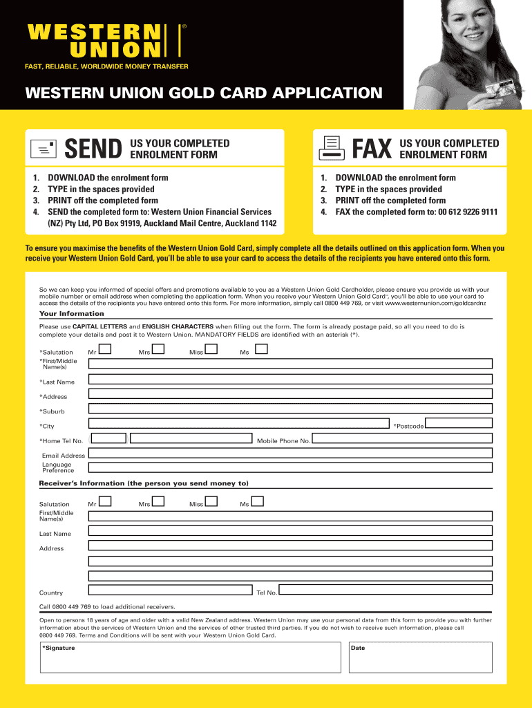 WESTERN UNION GOLD CARD APPLICATION 6 FAX + SEND US YOUR COMPLETED Enrollment FORM 1. 2. 3. 4. DOWNLOAD the enrollment form TYPE in the spaces provided PRINT off the completed form SEND the completed