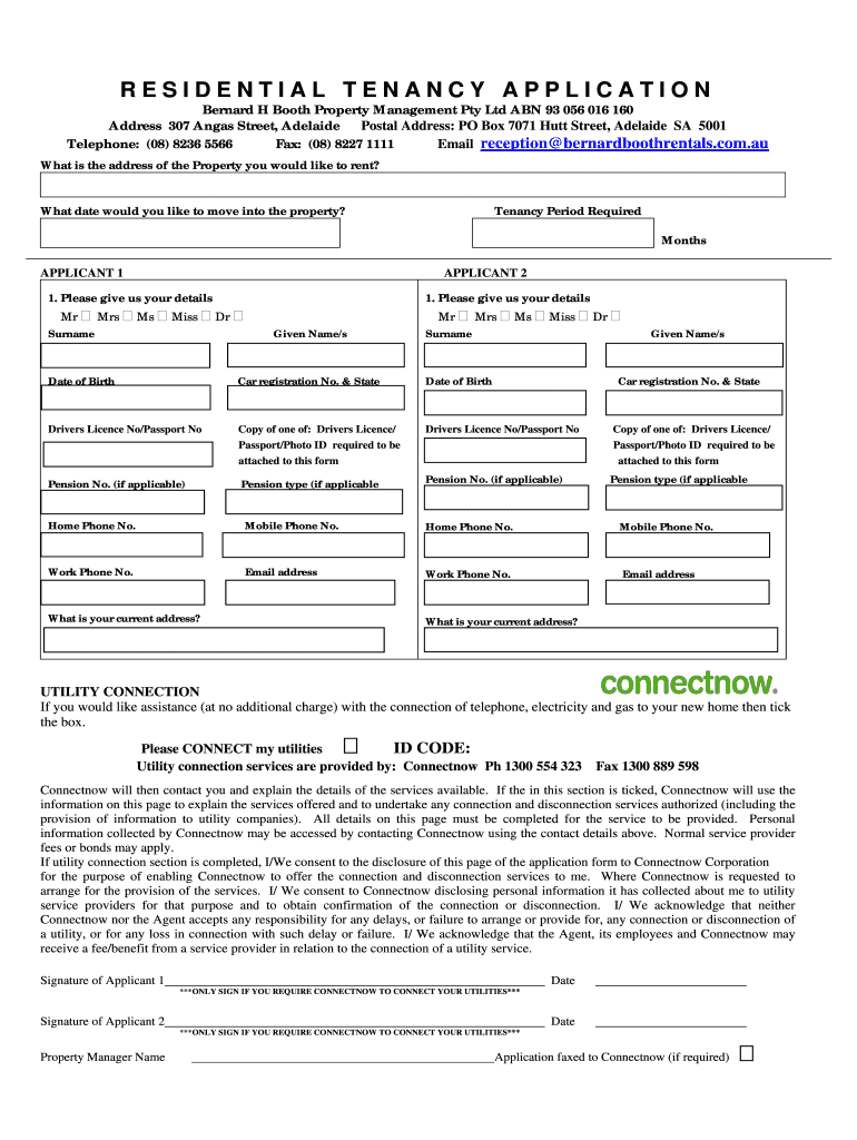 RESIDENTIAL TENANCY APPLICATION Bernard H Booth Property Management Pty Ltd ABN 93 056 016 160 Address 307 Angus Street, Adelaide Postal Address: PO Box 7071 Hunt Street, Adelaide SA 5001 Telephone: