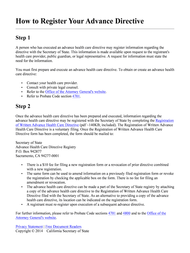 How to Register Your Advance Directive Step 1 A person who has executed an advance health care directive may register information regarding the directive with the Secretary of State. This information