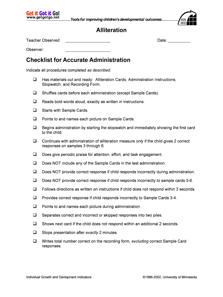 WWW.get got go.net Tools for improving children's developmental outcomes E RI C MG D Alliteration Teacher Observed: Observer: Date: Checklist for Accurate Administration Indicate all procedures completed