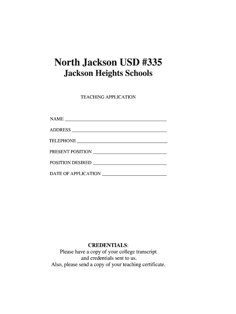 North Jackson USD #335 Jackson Heights Schools TEACHING APPLICATION NAME ADDRESS TELEPHONE PRESENT POSITION DESIRED DATE OF APPLICATION CREDENTIALS: Please have a copy of your college transcript and
