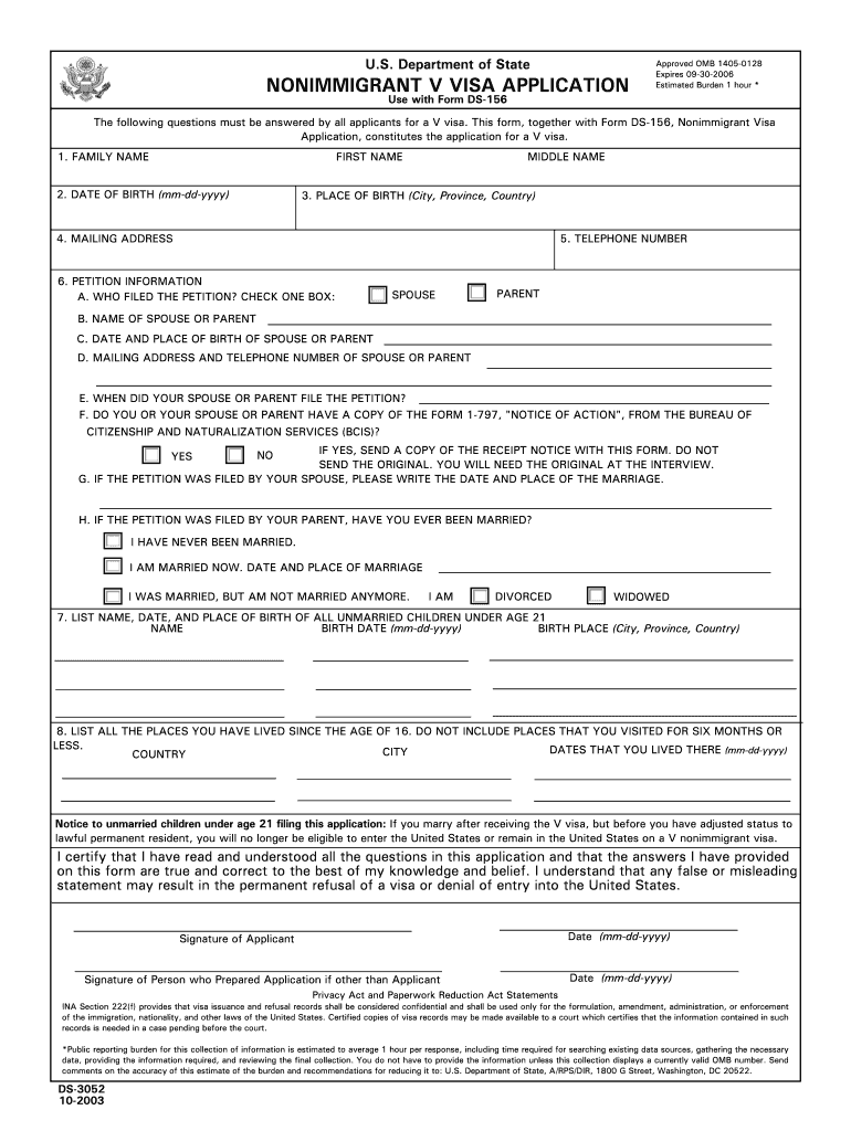 U.S. Department of State IMMIGRANT V VISA APPLICATION Approved OMB 14050128 Expires 09302006 Estimated Burden 1 hour * Use with Form DS156 The following questions must be answered by all applicants