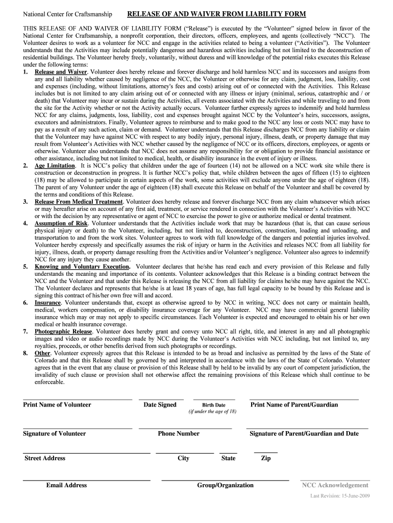 National Center for Craftsmanship RELEASE OF AND WAIVER FROM LIABILITY FORM THIS RELEASE OF AND WAIVER OF LIABILITY FORM (Release) is executed by the Volunteer signed below in favor of the National