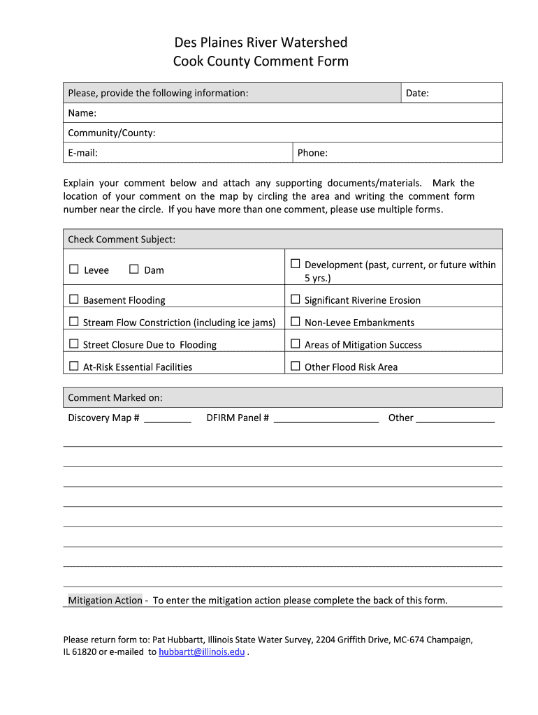 Des Plaines River Watershed Cook County Comment Form Please, provide the following information: Date: Name: Community/County: Email: Phone: Explain your comment below and attach any supporting documents/materials.