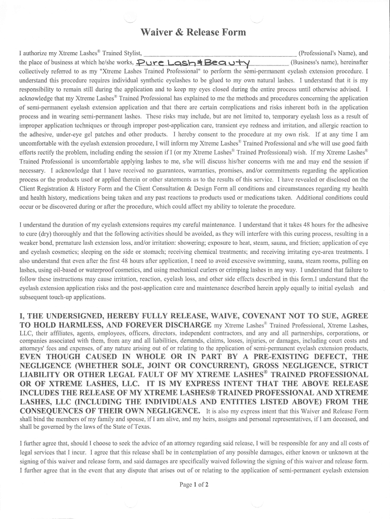 Waiver & Release Form I authorize my Extreme Lashes (Professional's Name), and Trained Stylist, the place of business at which he/she works, Pure LSF * BGQ UL (Business's name), hereinafter collectively