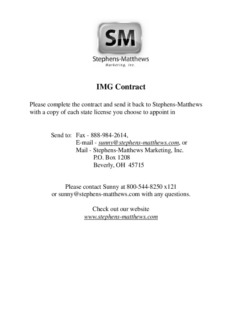 IMG Contract Please complete the contract and send it back to Stephens Matthews with a copy of each state license you choose to appoint intend to: Fax 8889842614, Email sunny stephensmatthews.com,