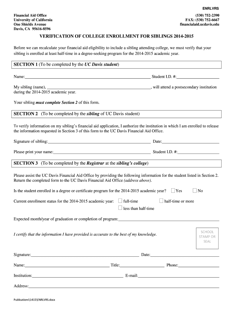 ENTERS Financial Aid Office University of California One Shields Avenue Davis, CA 956168596 (530) 7522390 FAX: (530) 7526667 financial aid.McDavis.edu VERIFICATION OF COLLEGE ENROLLMENT FOR SIBLINGS