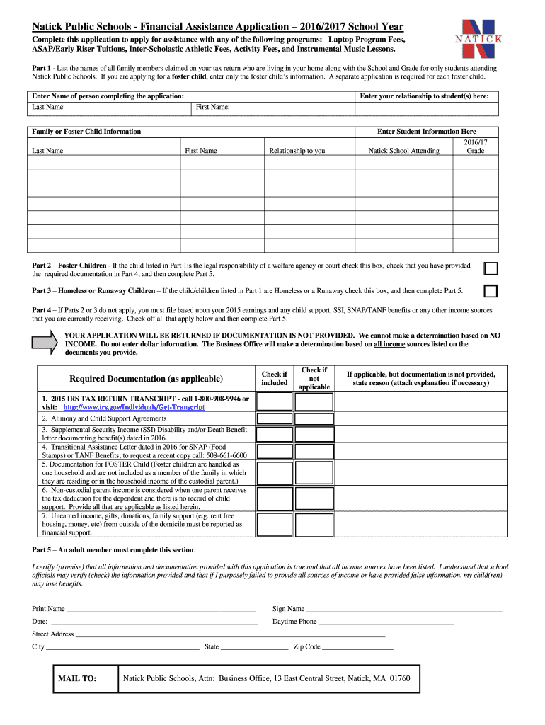 Get the free Natick Public Schools Financial Assistance Program For the - natickps