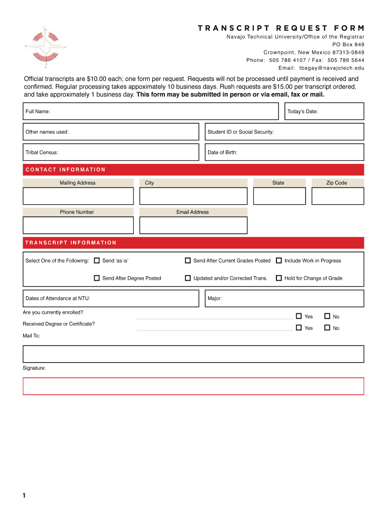 TRANSCRIPT REQUEST FORM N a v a j o Te c h n i c an l U n i v e r s i t y / O ff i c e of the R e g i STR an r PO Box 8 4 9 C r o w n p o i n t, N e w M e x ICO 8 7 3 1 3 0 8 4 9 Phone: 505 786 4107