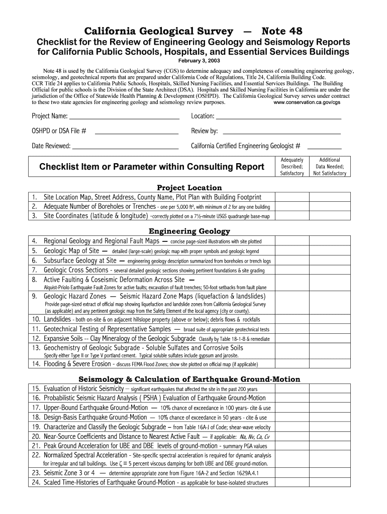 California Geological Survey Note 48 Checklist for the Review of Engineering Geology and Seismology Reports for California Public Schools, Hospitals, and Essential Services Buildings February 3, 2003,