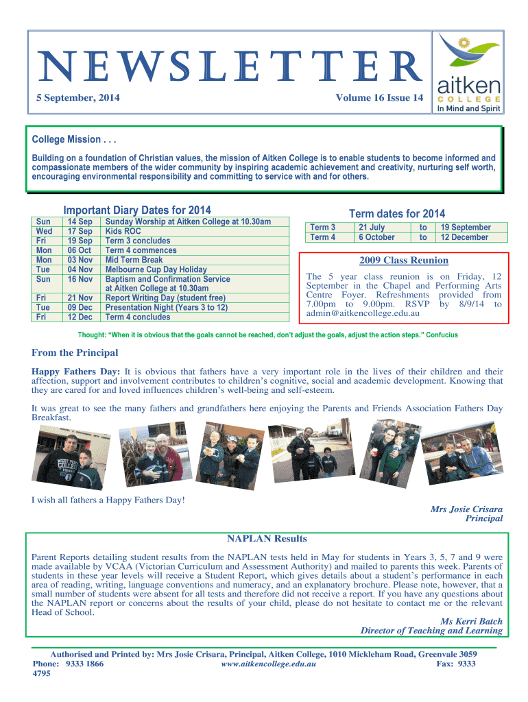 Get the free N E WS L E T T E R 5 September, 2014 Volume 16 Issue 14 College Mission - aitkencoll...