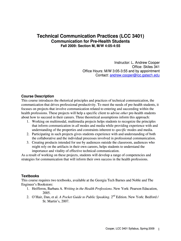 Technical Communication Practices (LCC 3401) Communication for Preheat Students Fall 2009: Section M, M/W 4:054:55 Instructor: L. Andrew Cooper Office: Skills 341 Office Hours: M/W 3:053:55 and by