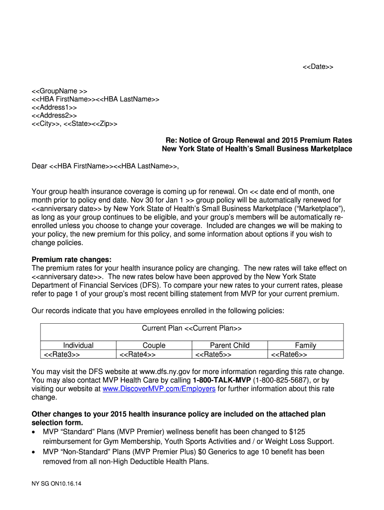 Date Groupware HBA FirstNameHBA Hostname Address1 Address2 City, State Re: Notice of Group Renewal and 2015 Premium Rates New York State of Health Small Business Marketplace Dear HBA FirstNameHBA