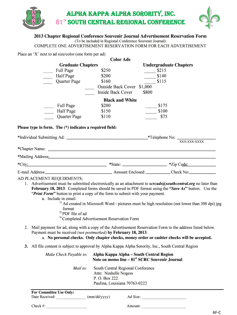 Save As Reset Form Print Form Alpha Kappa Alpha Sorority, Inc. 81st South Central Regional Conference 2013 Chapter Regional Conference Souvenir Journal Advertisement Reservation Form (To be included