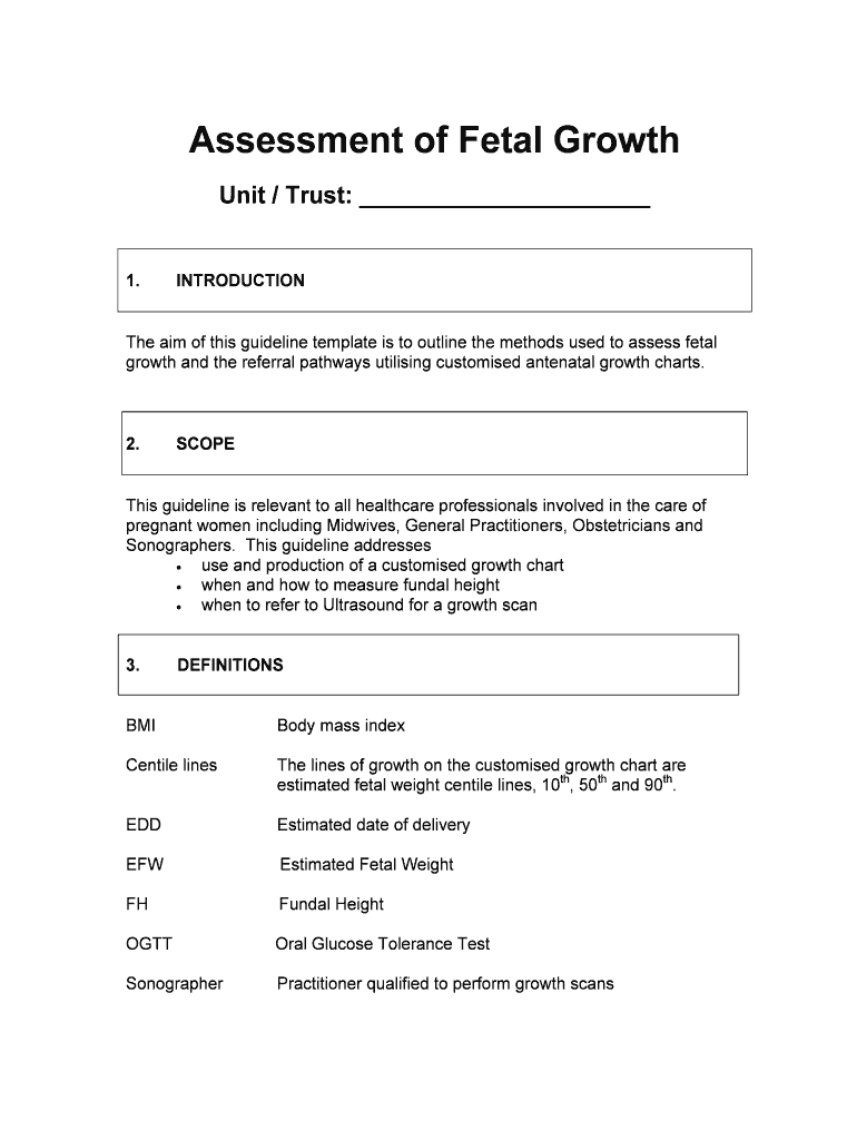 Assessment of Fetal Growth Unit / Trust: 1. Introduction aim of this guideline template is to outline the methods used to assess fetal growth and the referral pathways utilizing customized antenatal