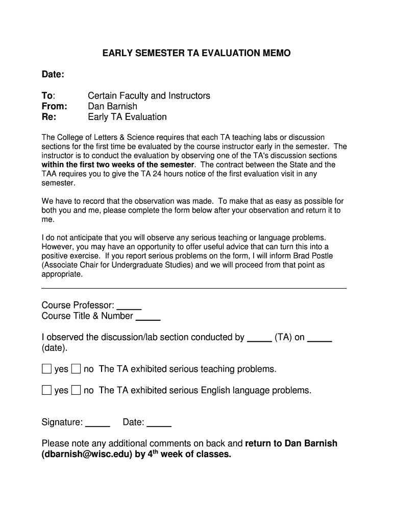 Get the free EARLY SEMESTER TA EVALUATION MEMO To - psych wisc