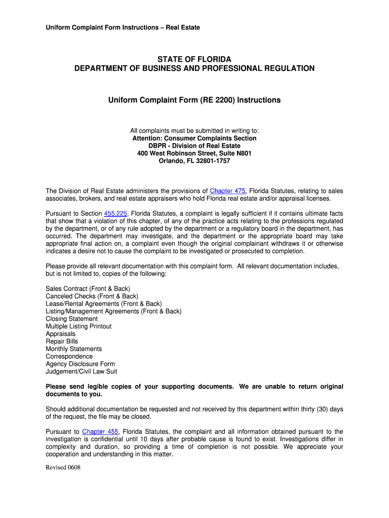 Uniform Complaint Form Instructions Real Estate STATE OF FLORIDA DEPARTMENT OF BUSINESS AND PROFESSIONAL REGULATION Uniform Complaint Form (RE 2200) Instructions All complaints must be submitted in