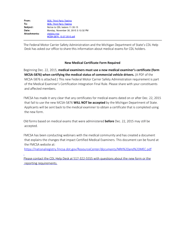 From: To: Subject: Date: Attachments:SOS, Third Party Testing SOS, Third Party Testing Notice to CDL testers 113015 Monday, November 30, 2015 3:13:32 PM ole data.MSO MCSA5876 10.07.2015.the Federal