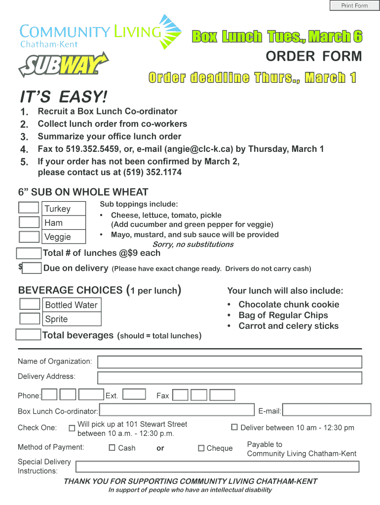 Print Form Box Lunch Tues., March 6 ORDER FORM Order deadline Thurs., March 1 ITS EASY! 1. 2. 3. 4. 5. Recruit a Box Lunch Coordinator Collect lunch order from coworkers Summarize your office lunch