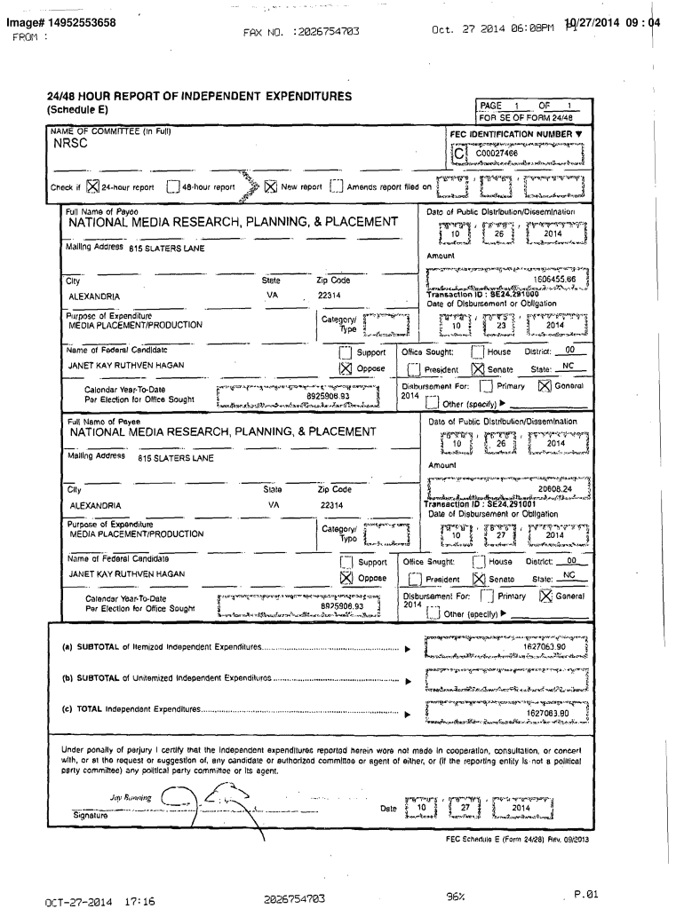 Image# 14952553658 For Oct. 27 2014 06:08PM 10/27/2014 09 : 04 PI FAX NO. 2026754703 24/48 HOUR REPORT OF INDEPENDENT EXPENDITURES (Schedule E) PAGE NAME OF COMMITTEE (In Fuji) TCF OF 1 FEC IDENTIFICATION