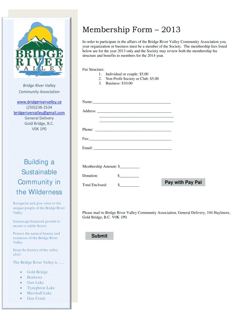 Membership Form 2013 In order to participate in the affairs of the Bridge River Valley Community Association you, your organization or business must be a member of the Society. The membership fees