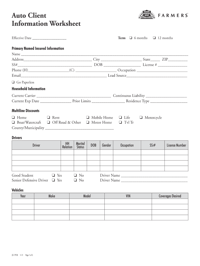 Auto Client Information Worksheet Term q 6 months Effective Date q 12 months Primary Named Insured Information Name Address City State ZIP SS# DOB License # Phone (H) Occupation Email Lead Source