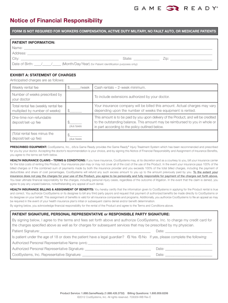 Notice of Financial Responsibility FORM IS NOT REQUIRED FOR WORKERS COMPENSATION, ACTIVE DUTY MILITARY, NO FAULT AUTO, or Medicare PATIENTS PATIENT INFORMATION: Name: Address: City: State: Zip: Date