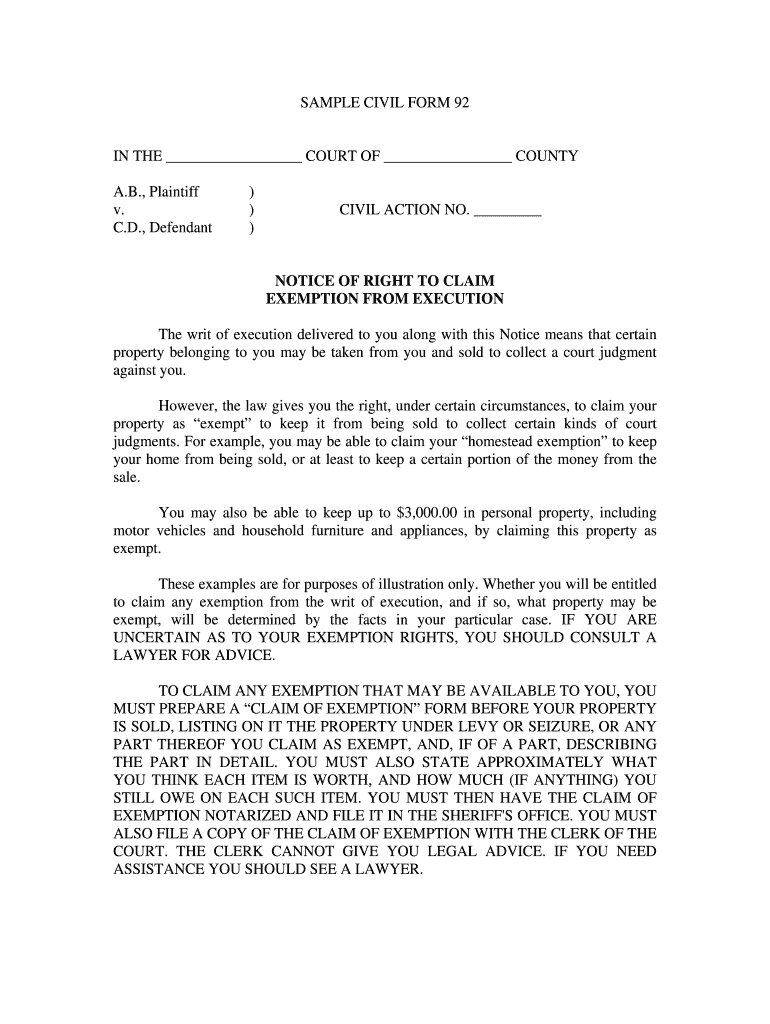 SAMPLE CIVIL FORM 92 IN THE COURT OF COUNTY A.B., Plaintiff v. C.D., Defendant))) CIVIL ACTION NO. NOTICE OF RIGHT TO CLAIM EXEMPTION FROM EXECUTION The writ of execution delivered to you along with