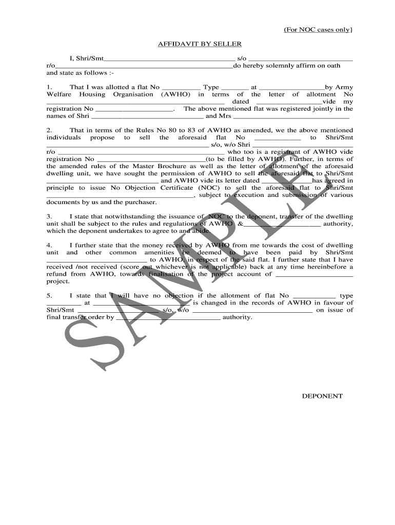 (For NOC cases only AFFIDAVIT BY SELLER I, Sari/SMT s/o r/o do hereby solemnly affirm on oath and state as follows :1. That I was allotted a flat No Type at by Army Welfare Housing Organization (WHO)