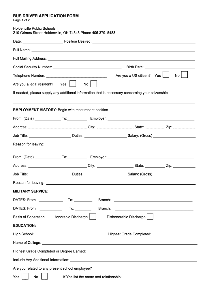 BUS DRIVER APPLICATION FORM Page 1 of 2 Hodgenville Public Schools 210 Grimes Street Hodgenville, OK 74848 Phone 405.379. 5483 Date: Position Desired: Full Name: Full Mailing Address: Social Security