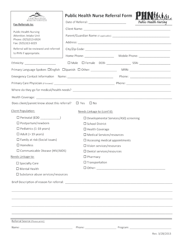 PublicHealthNurseReferralForm FaxReferralsto: PublicHealthNursing A en on:IntakeUnit Phone:(925)3136924 Fax:(925)3136029 Referralwillbereviewedandreferred toPHNifappropriate. Ethnicity: DateofReferral:
