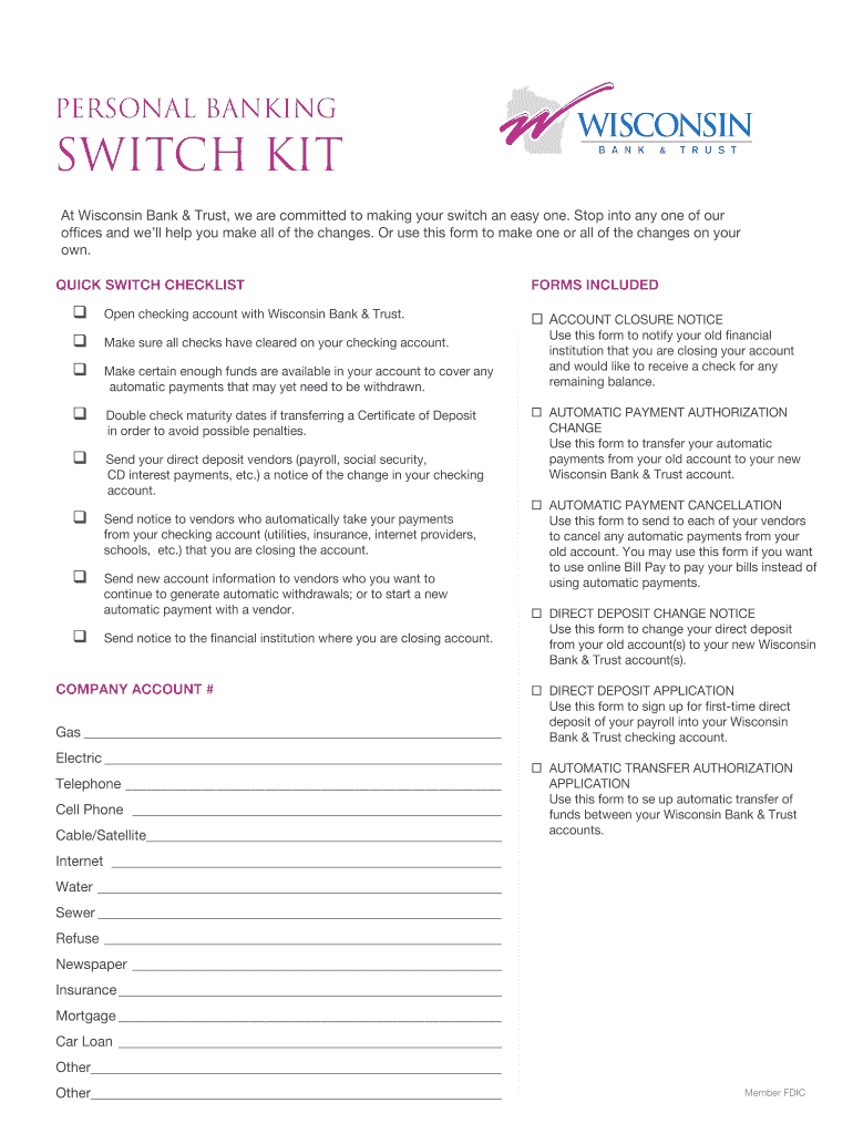 At Wisconsin Bank & Trust, we are committed to making your switch an easy one. Stop into any one of our offices and well help you make all the changes. Or use this form to make one or all of the changes
