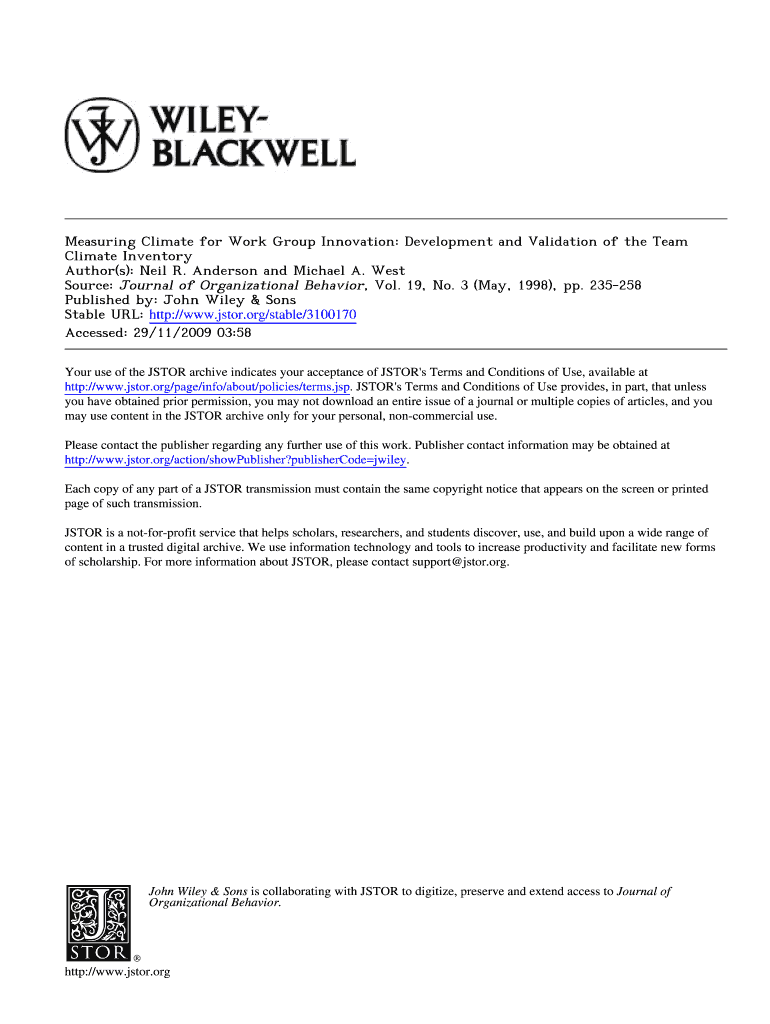 Measuring Climate for Work Group Innovation: Development and Validation of the Team Climate Inventory Author(s): Neil R. Anderson and Michael A. West Source: Journal of Organizational Behavior, Vol.