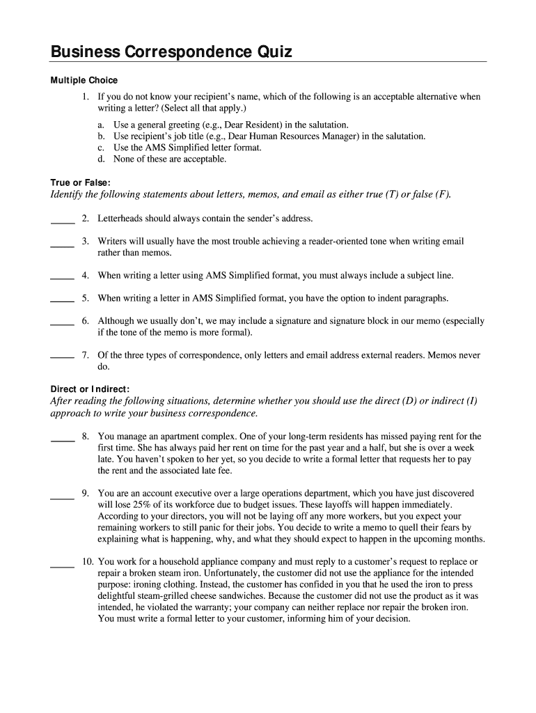 Fill out your business correspondence quiz online with pdfFiller!