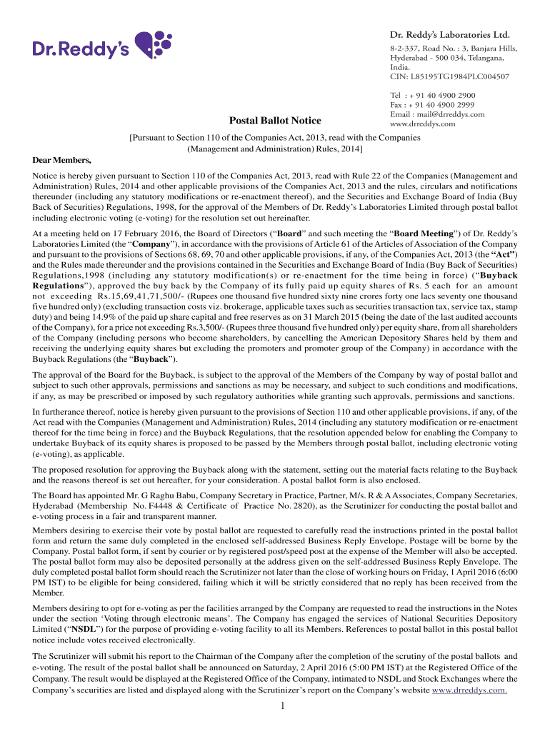 Postal Ballot Notice Pursuant to Section 110 of the Companies Act, 2013, read with the Companies (Management and Administration) Rules, 2014 Dear Members, Notice is hereby given pursuant to Section