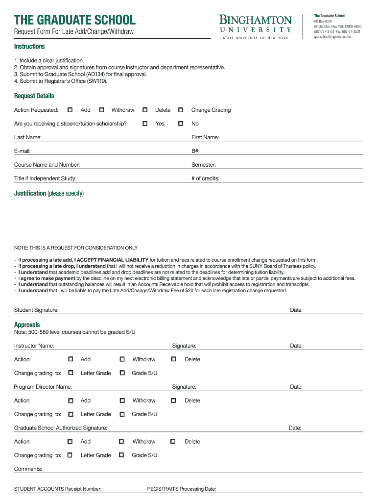 THE GRADUATE SCHOOL The Graduate School PO Box 6000 Binghamton, New York 139026000 6077772151, Fax: 607772501 grad school.Binghamton.edu Request Form For Late Add/Change/Withdraw Instructions 1. Include