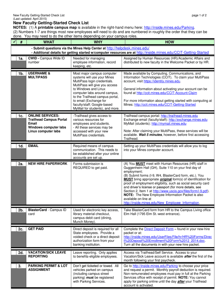 New Faculty GettingStarted Check List (Last updated: April 2015) page 1 of 2 New Faculty GettingStarted Check List NOTES: (1) A printable campus map is available in the right-hand menu here: http://inside.mines.edu/Parking.