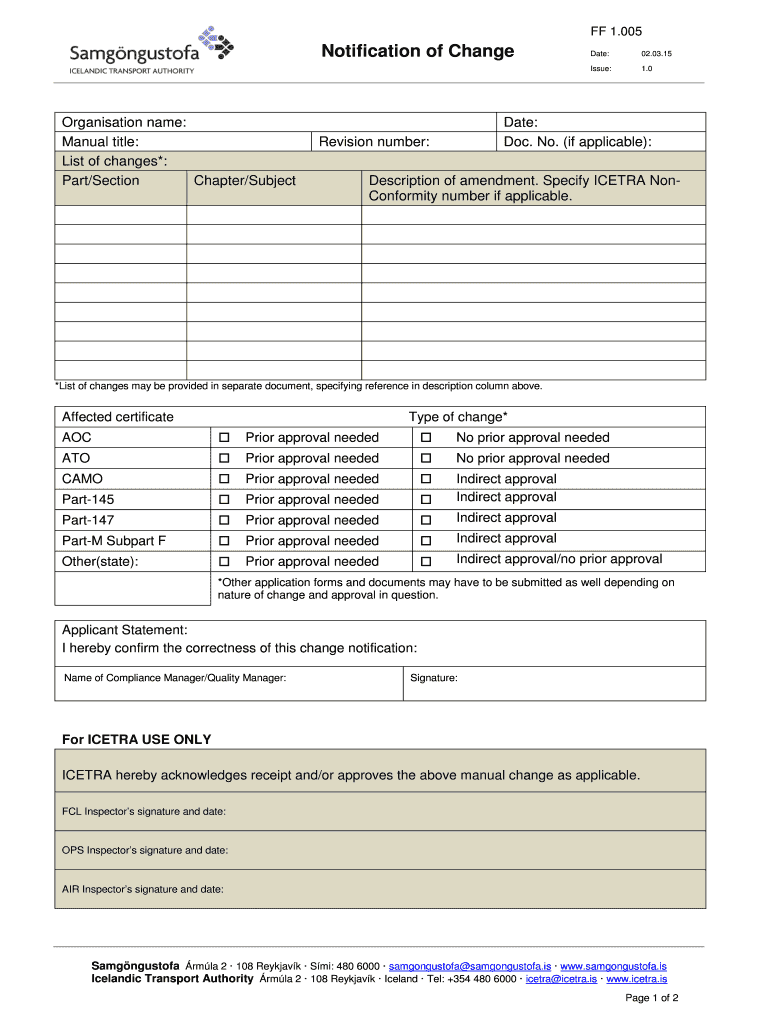 FF 1.005 Notification of Change Organization name: Manual title: List of changes*: Part/Section Chapter/Subject Date: 02.03.15 Issue: 1.0 Date: Doc. No. (if applicable): Revision number: Description