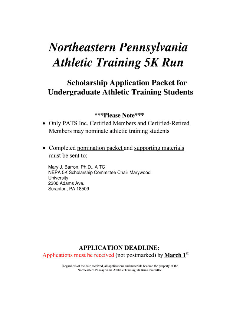 Northeastern Pennsylvania Athletic Training 5K Run Scholarship Application Packet for Undergraduate Athletic Training Students ***Please Note*** Only PATS Inc. Certified Members and CertifiedRetired